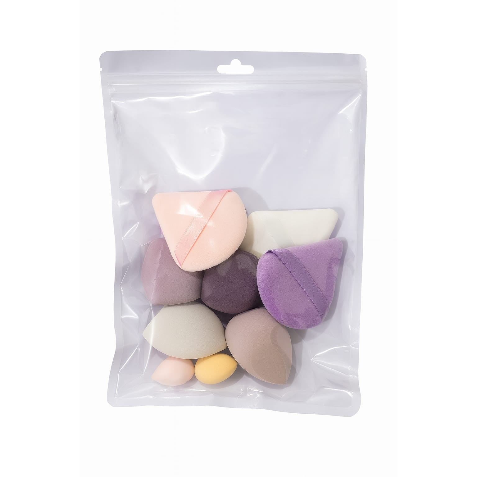 مجموعة من إسفنجات ومناديل المكياج متعددة الأشكال لتوزيع ومزج كريم الأساس، والكونسيلر، والكريمات، والبودرة بشكل متساوٍ. مناسبة للاستخدام الجاف أو الرطب حسب النتيجة المرجوة، وتساعد على الوصول بدقة إلى الزوايا والحواف.