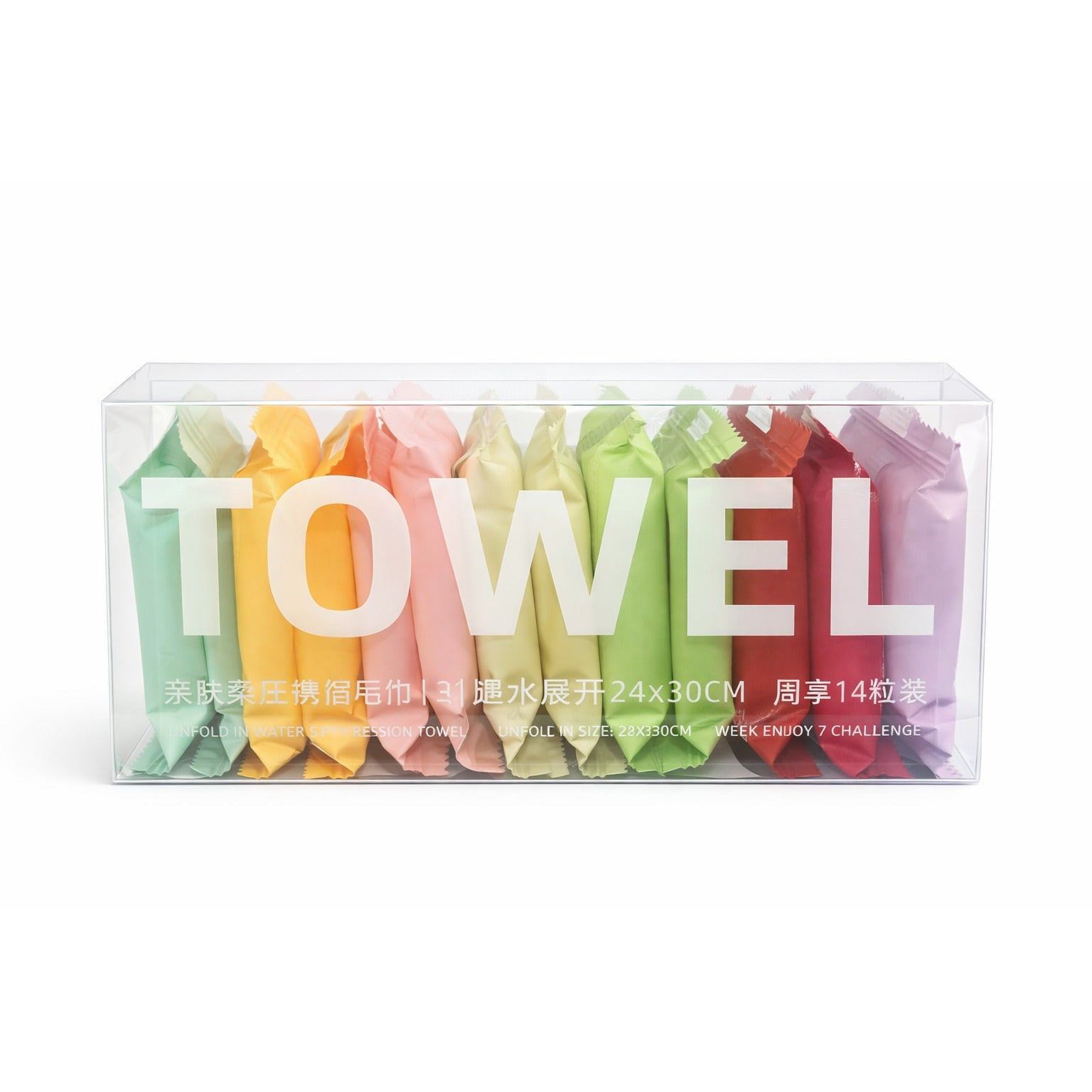 مناشف/مناديل وجه مضغوطة للاستخدام مرة واحدة، كل منها مغلفة على حدة وتتمدد عند ملامستها للماء. مناسبة للسفر، والنادي الرياضي، والمنتجعات الصحية، ولتنظيف اليدين والوجه بسرعة ونظافة وسهولة.