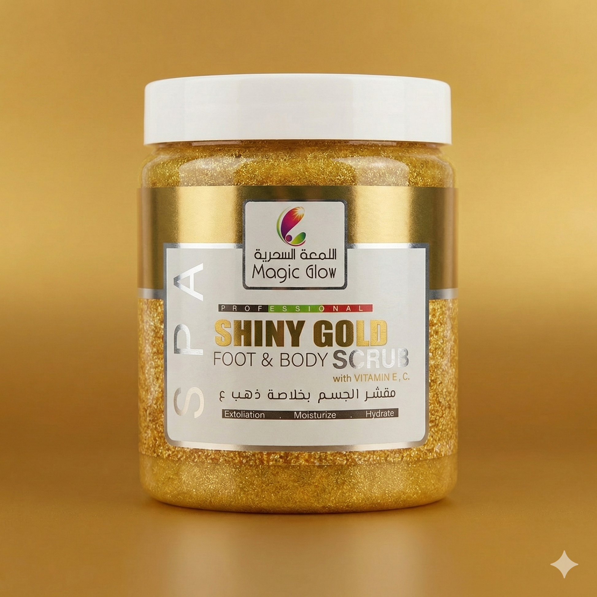 Experience a professional spa treatment with the Magic Glow Shiny Gold Foot & Body Scrub. This premium formula is enriched with Vitamin E and Vitamin C to nourish your skin while providing gentle yet effective exfoliation. Designed to moisturize and hydrate, it leaves both your feet and body feeling incredibly smooth, soft, and refreshed with a healthy-looking glow.