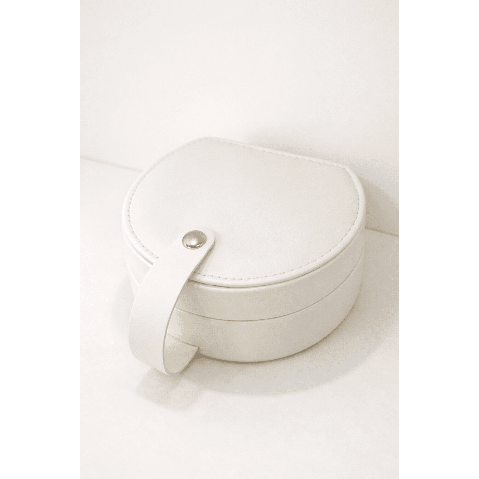 A round travel jewelry organizer box in mint color, lined inside to protect pieces from scratches. It has dedicated ring compartments, sections for necklaces/bracelets, and earring holders inside the lid. Its practical size and lightweight design make it ideal for a purse, travel, or everyday accessory organization.